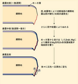 ZAM材は、亜鉛-アルミニウム6%、マグネシウム3%のめっき層を持つ新しい溶融めっき鋼板です。耐食性が溶融亜鉛メッキ鋼板の10~20倍、溶融亜鉛-5%アルミニウム合金めっき鋼板に比べ5~8倍とされています。